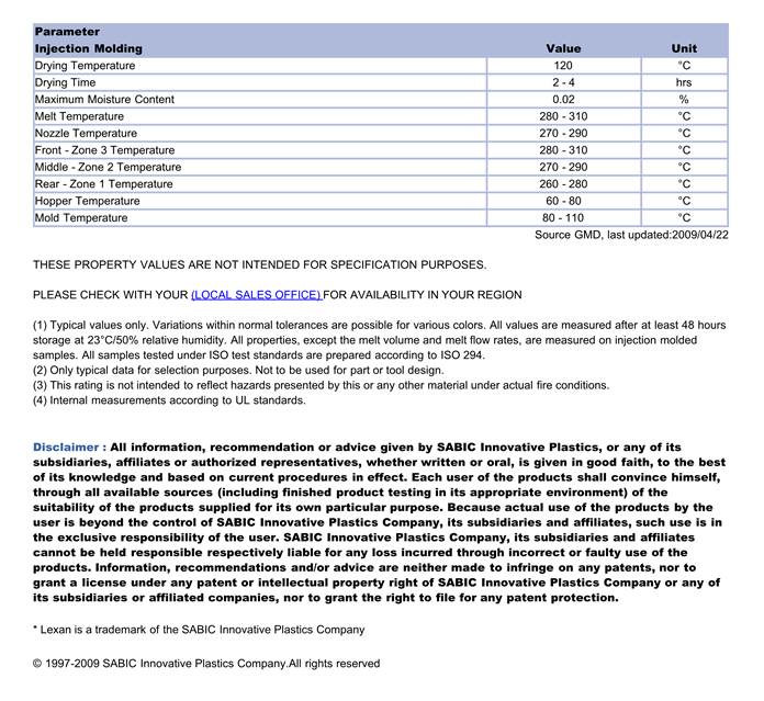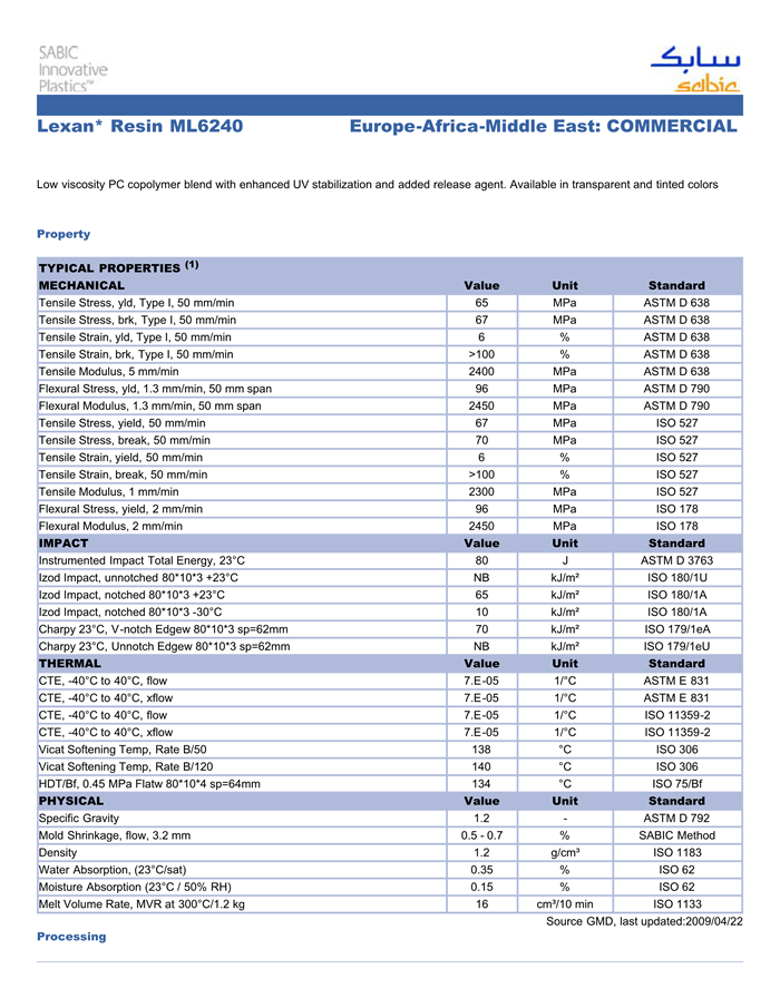 应用范围:产品描述LEXAN PC ML6240物性表Low viscosity PC copolymer blend with enhanced UV stabilization and added release agent. Available in transparent and tinted colors