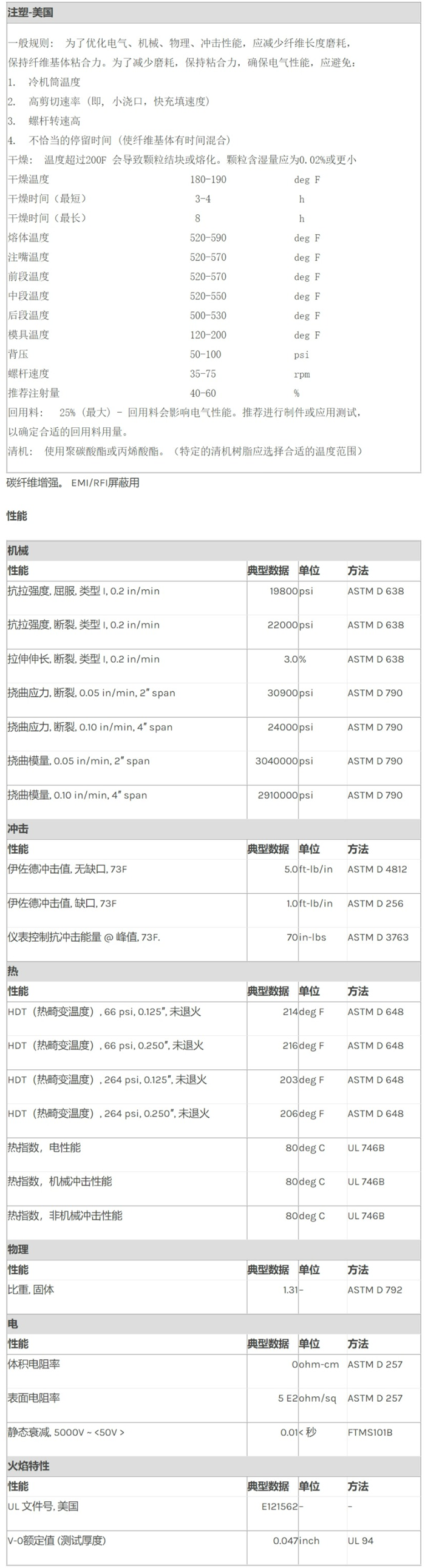 应用范围: 产品描述 Lexan PC SP7750物性表 碳纤维增强。 EMI/RFI屏蔽用 加工