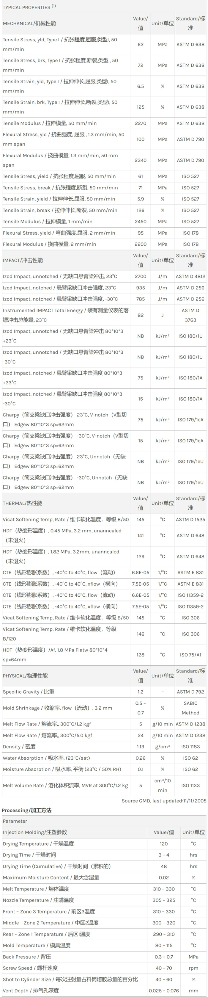 应用范围:产品描述Lexan PC HPS7R物性表“Lexan HPS7R resin是一种聚碳酸酯(PC)产品,它可以通过注射成型进行加工。典型应用领域为:医疗/保健。特性包括:具可灭菌性生物相容脱模剂”Low flow polycarbonate. For medical devices and pharmaceutical applications. Healthcare management of