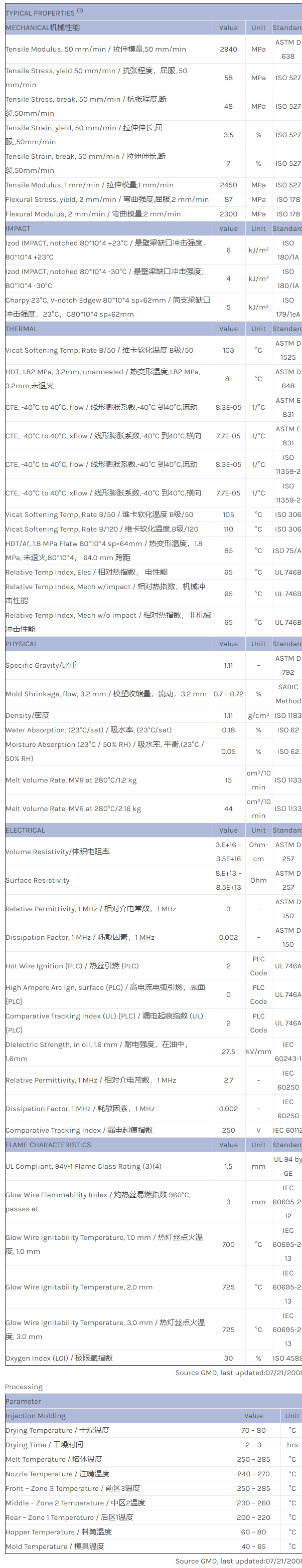 应用范围:产品描述NORYL PPO FP5140物性表Noryl*FP5140 is an unfilled, injection moldable modified polyphenylene ether resin with an ISO306 Vicat B/120 of 100 deg C. Designed for good dimensional stability and high flow