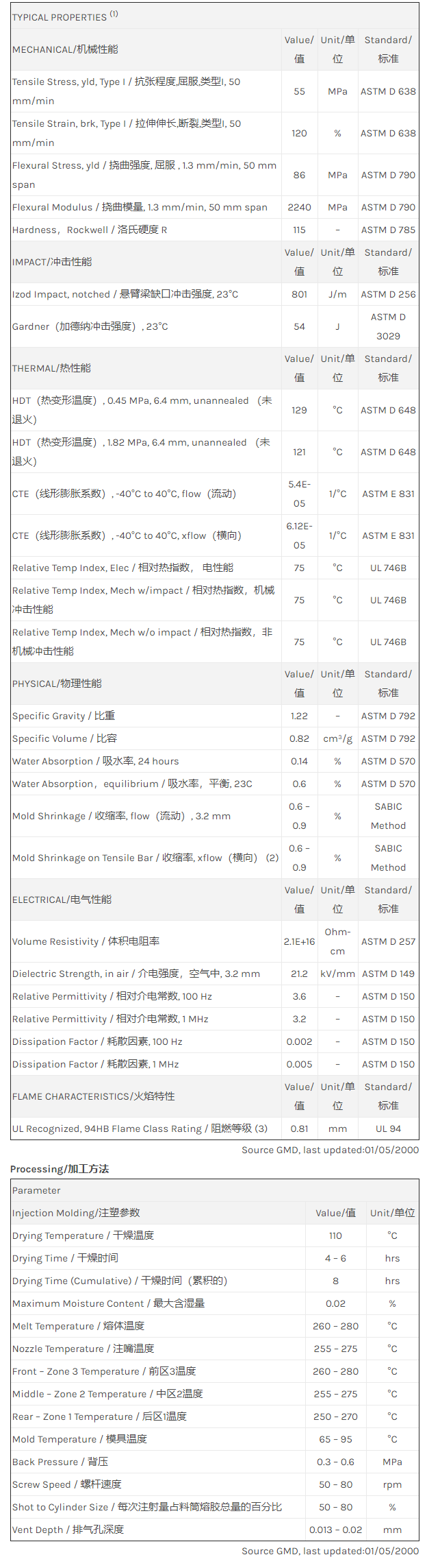 应用范围: 产品描述 Xenoy PC/PBT/PET 2230物性表 “XENOY 2230是一种聚碳酸脂+PET(PC+PET)产品,是未增强、不透明、基于聚碳酸酯聚合物的合金化聚合物,可以通过注射成型进行加工。 典型应用领域为:汽车行业。 特性包括: 阻燃/额定火焰 良好的尺寸稳定性 耐化学品 有一定的机械性能” 相关颜色色号:2230-1001、2230-BK1066 Unre